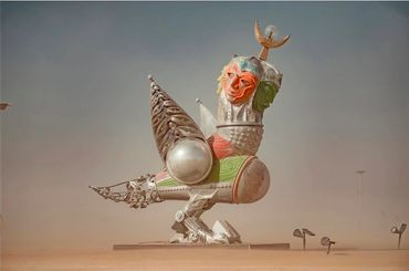 “The Quantum Existence” is a twelve-winged falcon standing 18 feet tall. Each unique wing is shiny, with various colors and geometric patterns symbolizing different dimensions. The geometric patterns represent countless potential directions and outcomes.